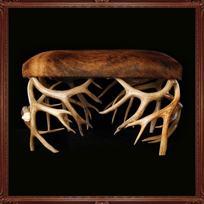 Elk antler and Mule deer antler are used here to create a functional piece of furniture. The elk antler is strong enough to bear weight. The mule deer antler makes for a great filler in completing the piece. Again, this antler bench can be done with your own fabric or hide and in custom sizes. As seen: 42L X 17w X 18h.